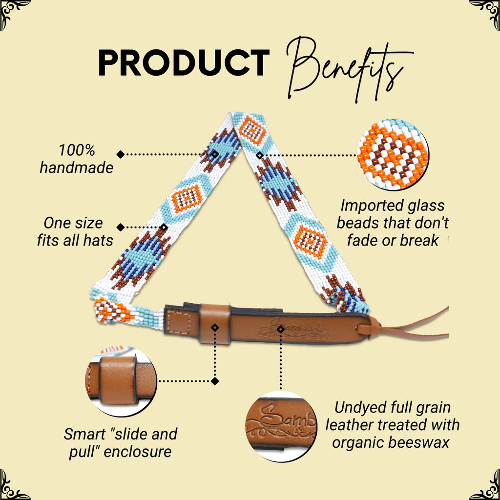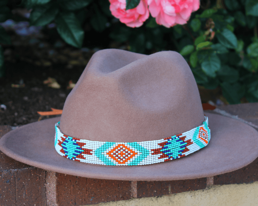 Dress up any hat with this western beaded leather hat band. Beautiful native patterns with vibrant colors. Bring a southern charm to your old favorites with this gorgeous hat band or make your new hat even more special. Made of full grain leather (highest grade leather) and glass beads. Handmade in Brazil by artisan women. You can match your hat band with our best-selling leather beaded dog collars! Treated with beeswax, water resistant. 30 days free returns or exchange. 1-year warranty. One size fits all. For men and women.