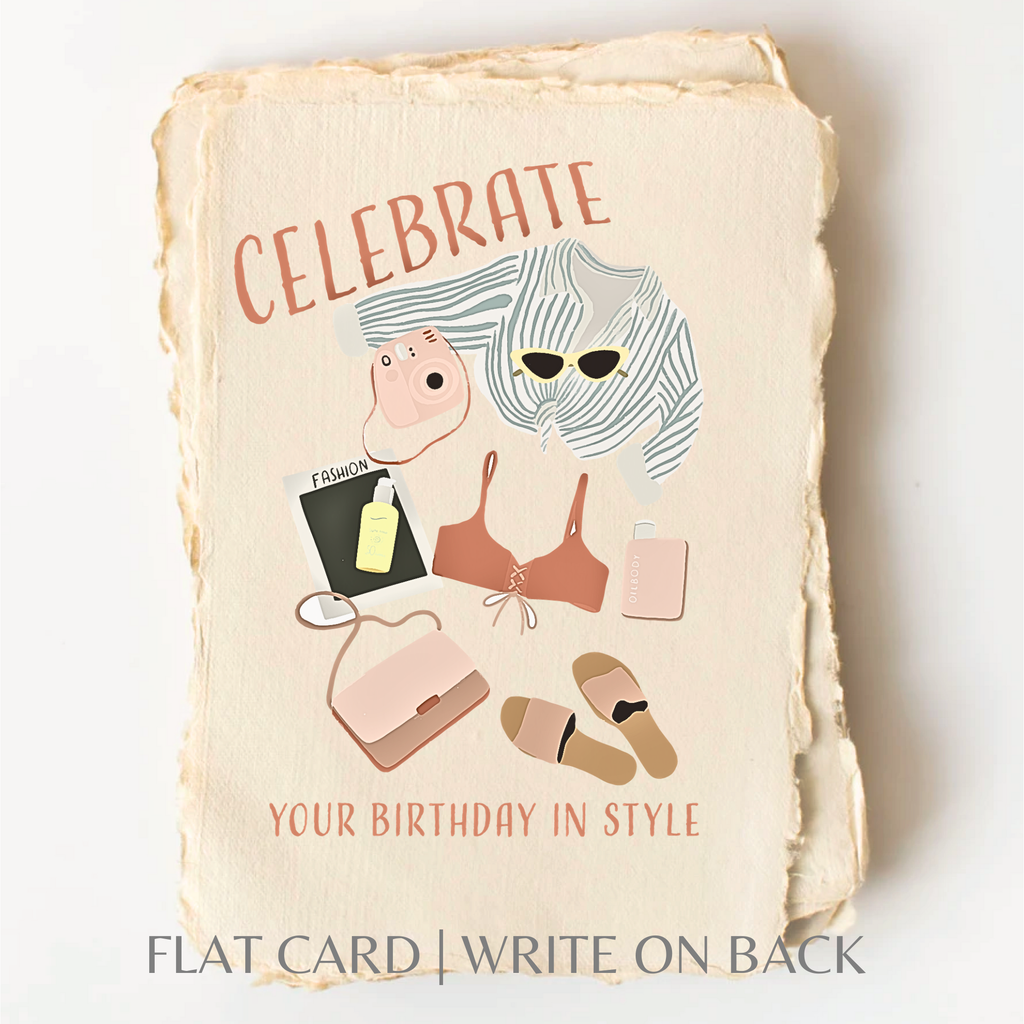 Eco-Friendly. Fair Trade. Gives Back. Paper Goods Brewed To Do Good. 10% Fighting Human Trafficking. Our handmade deckled edge paper collection is letterpress printed in-house late at night with lots of coffee. This card is meant to be treasured for years to come. Handmade paper beautiful enough to frame and helps us ensure there was no slave labor in our supply chain. 10% goes to fight for human rights in the supply chain. Saying: "Celebrate your birthday in style" FOLDED CARD 8.5"W x 5.5"L FLAT CARD 4.25"W x 5.5"L Color: Wheat Letterpress + Digitally Printed Terra Cotta Ink Gold Flat Flap Envelope Sleeved with Recycled Material and labeled. A2 FLAT or FOLDED CARD, Blank back to write on. Ethically made by Artisans, Hand printed in our USA studio