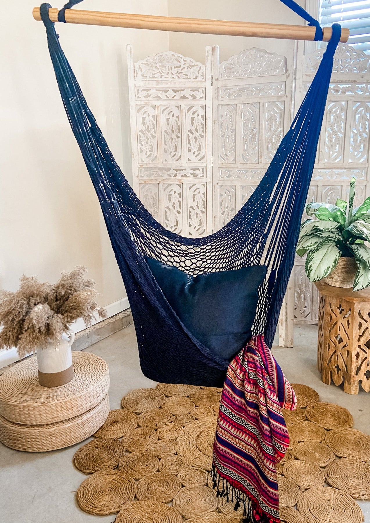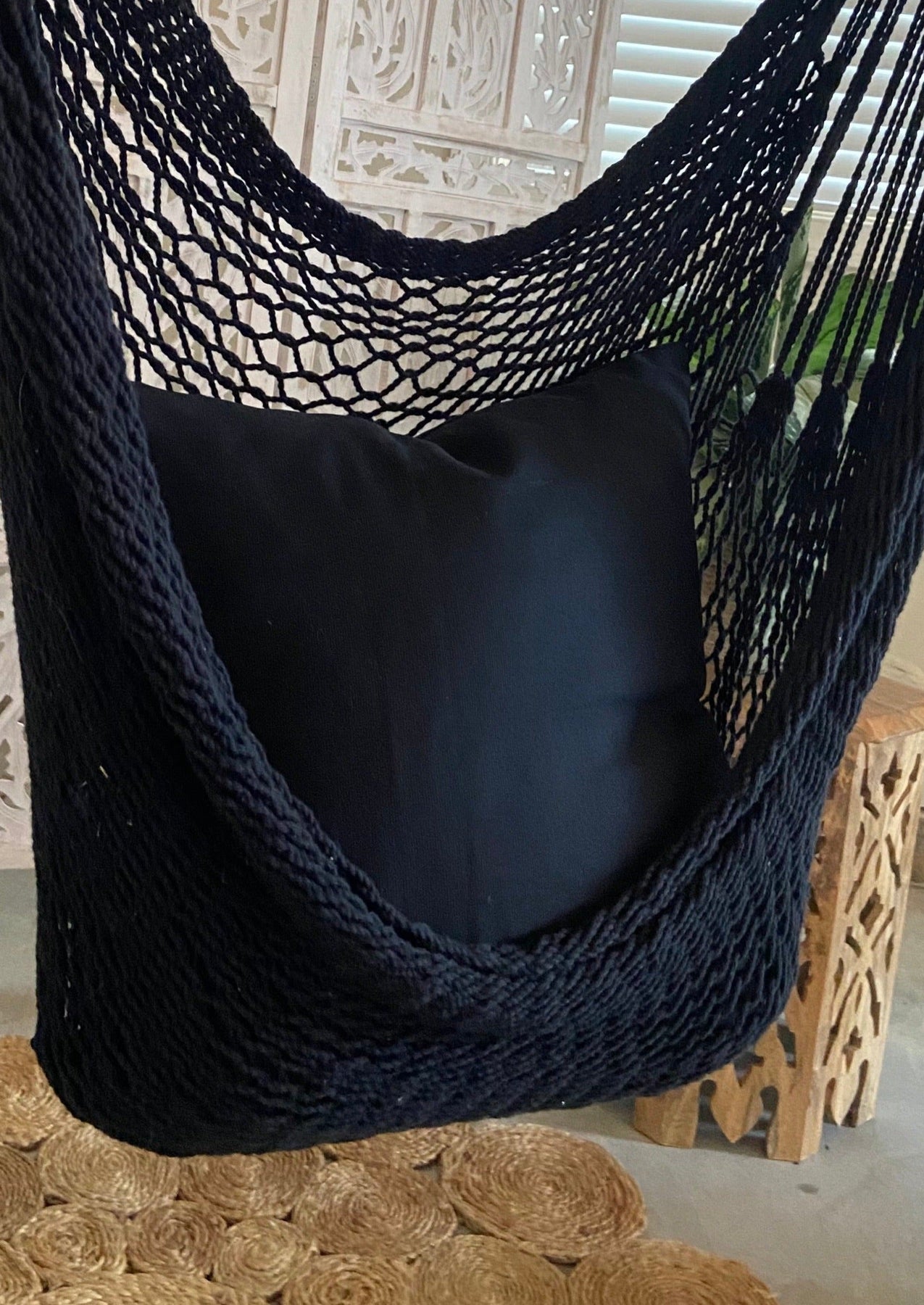 Lounge in style with this breezy black hammock swing chair. This delicately handwoven cotton hanging chair will help you create your favorite garden, porch, or patio hangout.  It comes with one matching soft cotton canvas accent pillow and it is perfect for indoor or outdoor covered use.
