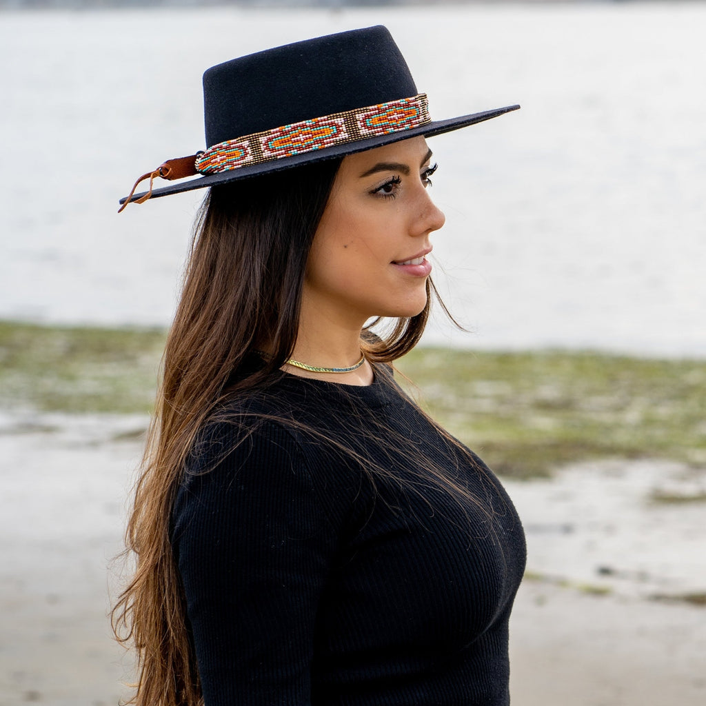 Dress up any hat with this western beaded leather hat band. Beautiful native patterns with vibrant colors. Bring a southern charm to your old favorites with this gorgeous hat band or make your new hat even more special. Made of full grain leather (highest grade leather) and glass beads. Handmade in Brazil by artisan women. You can match your hat band with our best-selling leather beaded dog collars! Treated with beeswax, water resistant. 30 days free returns or exchange. 1-year warranty. One size fits all. For men and women.