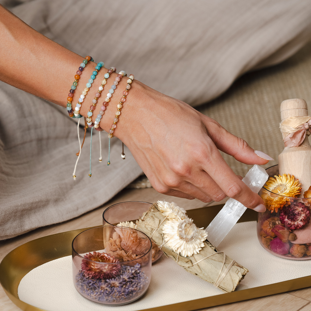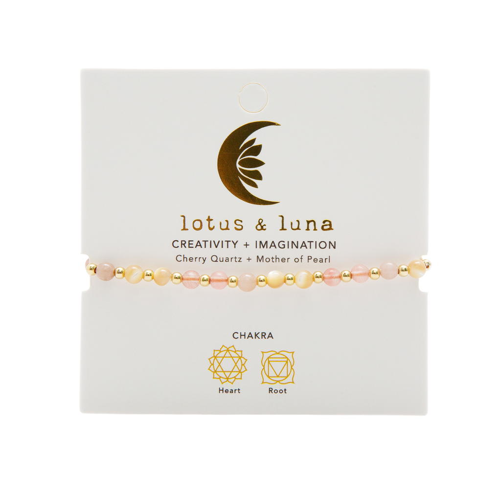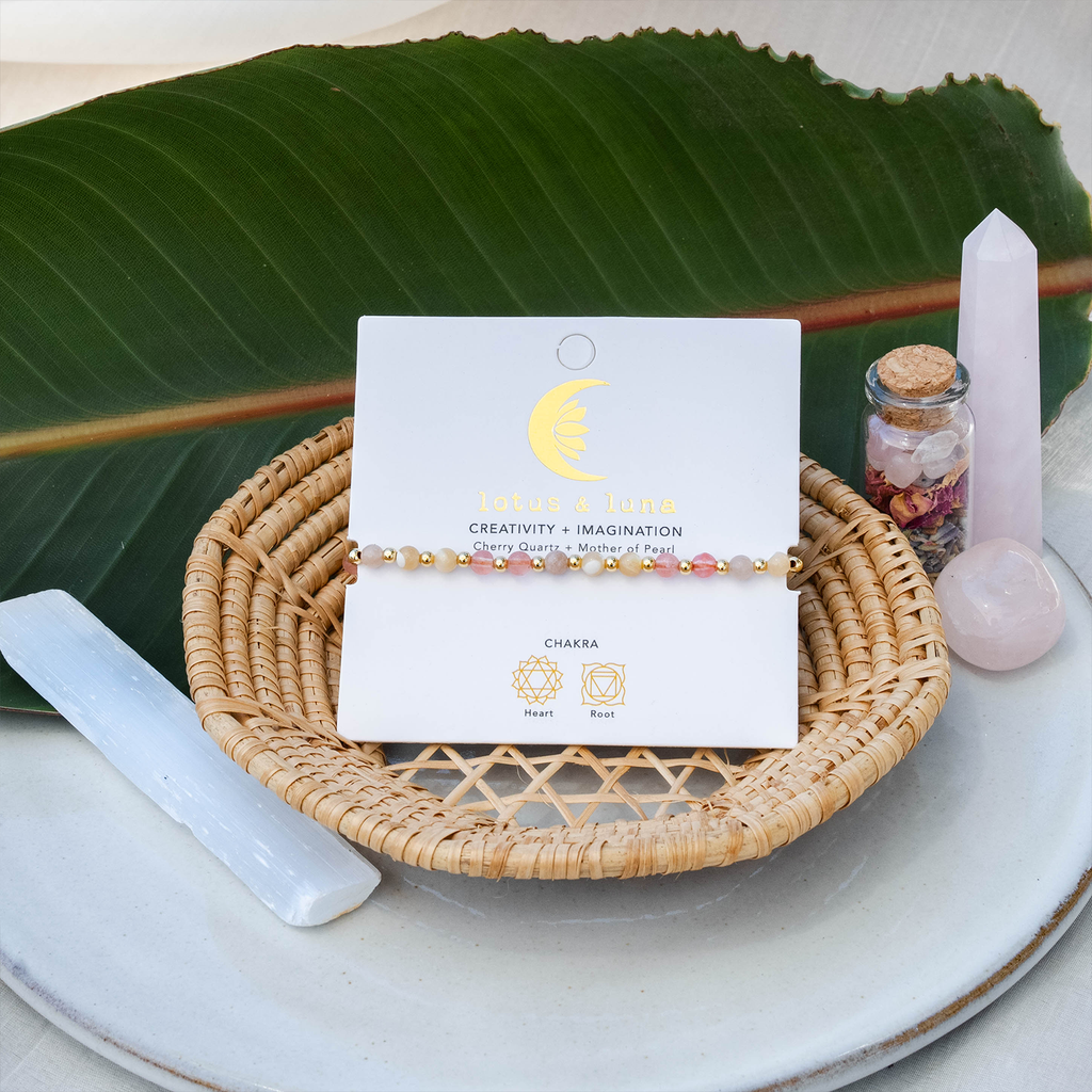 Cherry Quartz, provides energetic stimulation to the mind, body, and spirit, creating momentum for new ideas to flow. When combined with the grounding and imaginative frequencies of Mother of Pearl, an ideal playground for creativity and expression is yours to explore.