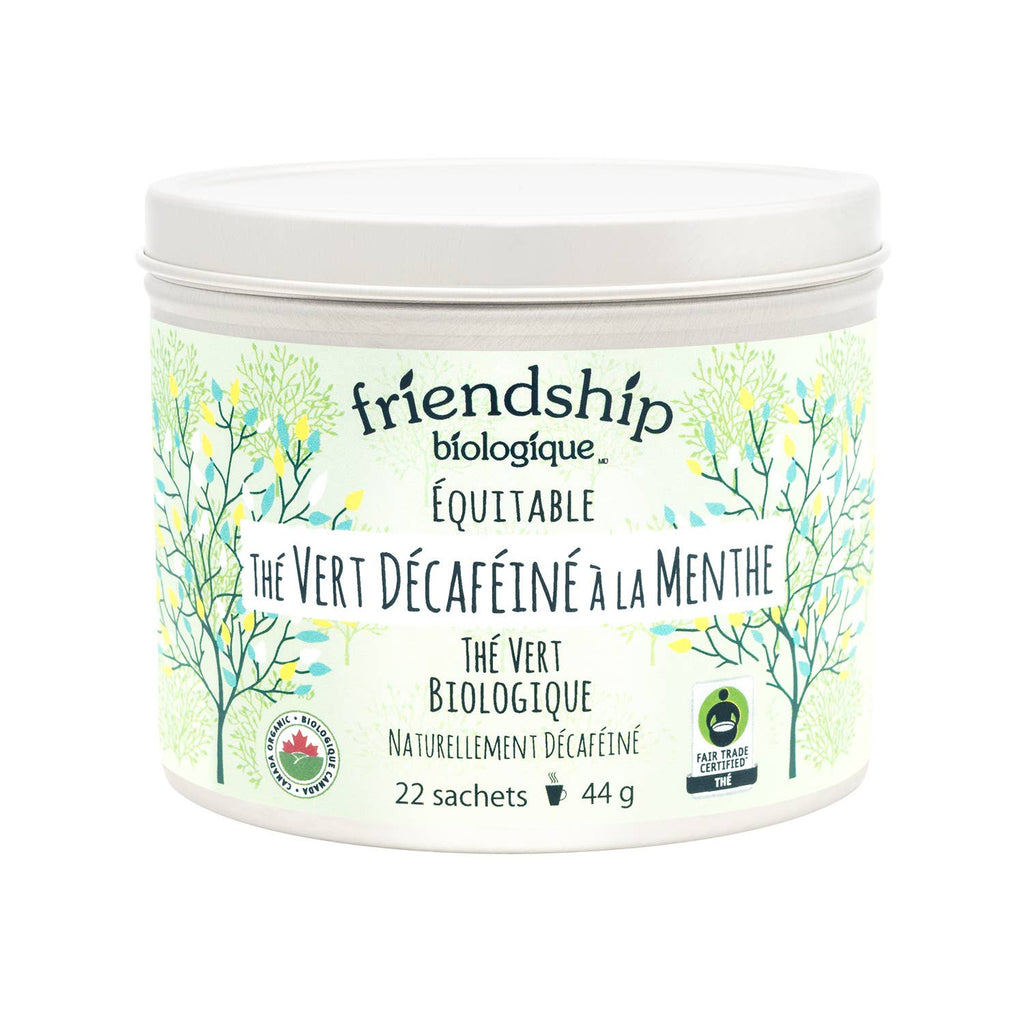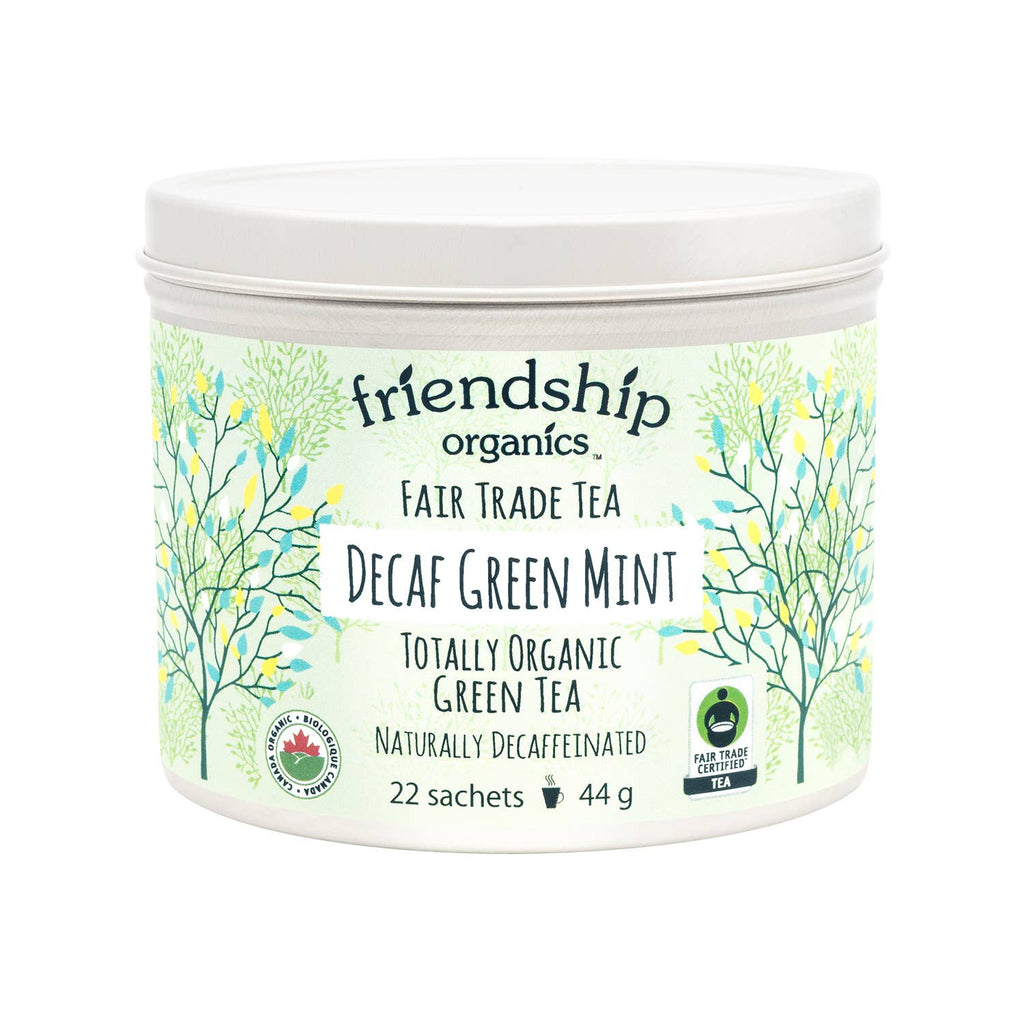 Fragrant and relaxing, our Decaf Green Mint tea is the perfect blend of organically grown green tea (always CO2 decaffeinated) and our amazing spearmint and peppermint leaves. It's perfect any time of the day, calming yet energizing. Squeeze the tea bag to get all of the flavor into your cup! Packed in a plastic-free cellophane bag, our tea sachets are made from natural abacá fiber and are themselves plastic-free. Our Tin can be reused countless times and is totally recyclable. Organic Certified, Fair Trade Certified and Kosher certified. All ingredients are non-GMO certified, cultivated without the use of pesticides, and naturally Gluten-free.