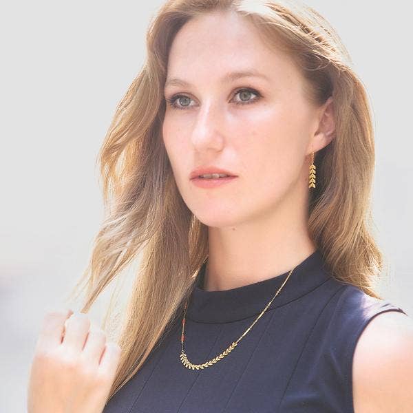 The Desert Wildflower Earrings evoke the petals of a desert flower with their five chevron pendants. They are made of 18K gold-plated stainless steel on 18K gold-plated sterling silver hooks. They hang 1.75" in length.