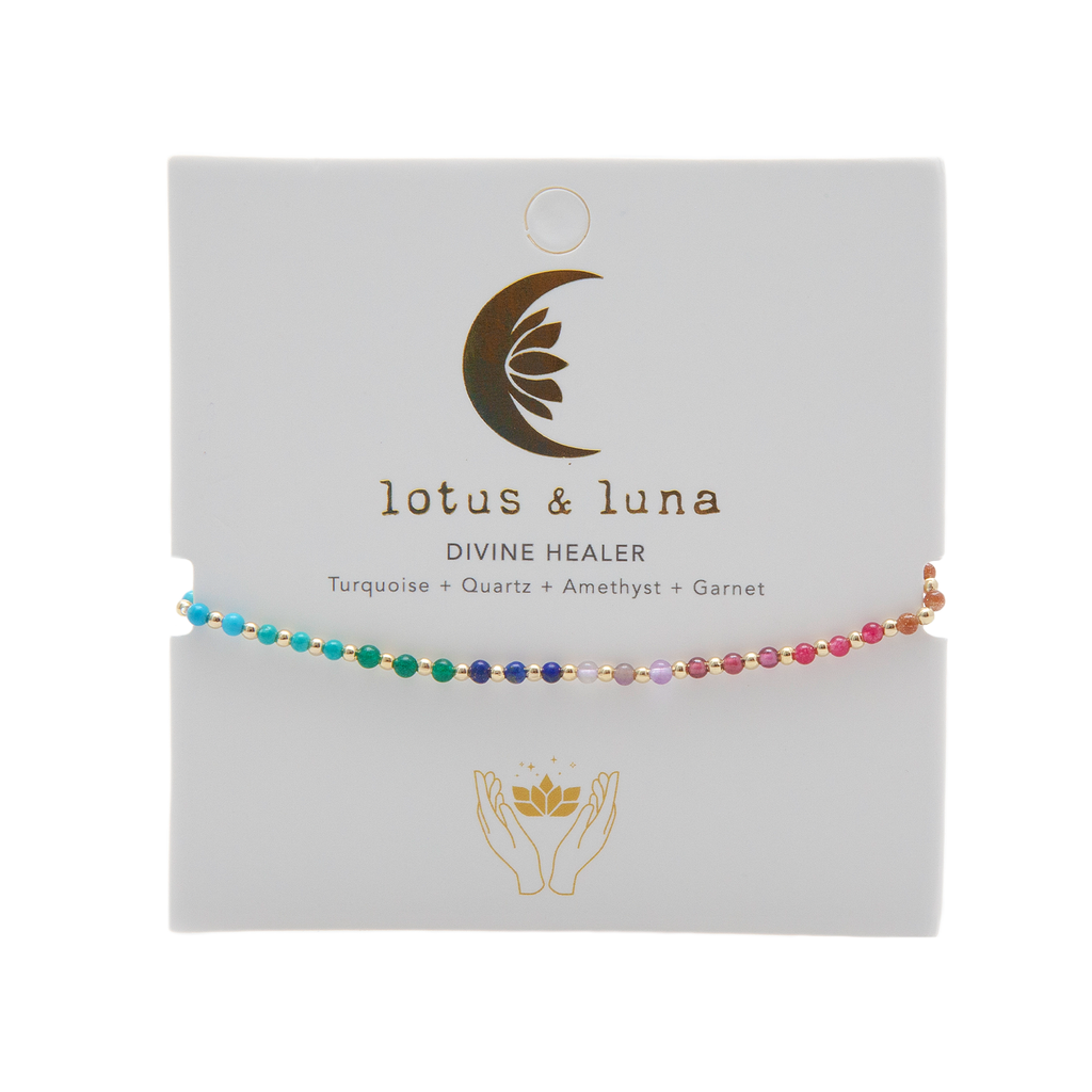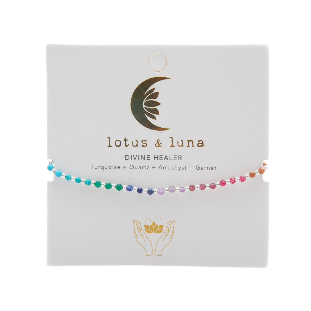 Amazonite, known for promoting inner peace and calming emotions, is amplified by the surrounding vibrations of Quartz, Lapis Lazuli, Turquoise, and more! With intention, embrace a cocoon of inner peace, healing, and growth with the Divine Healer Anklet.