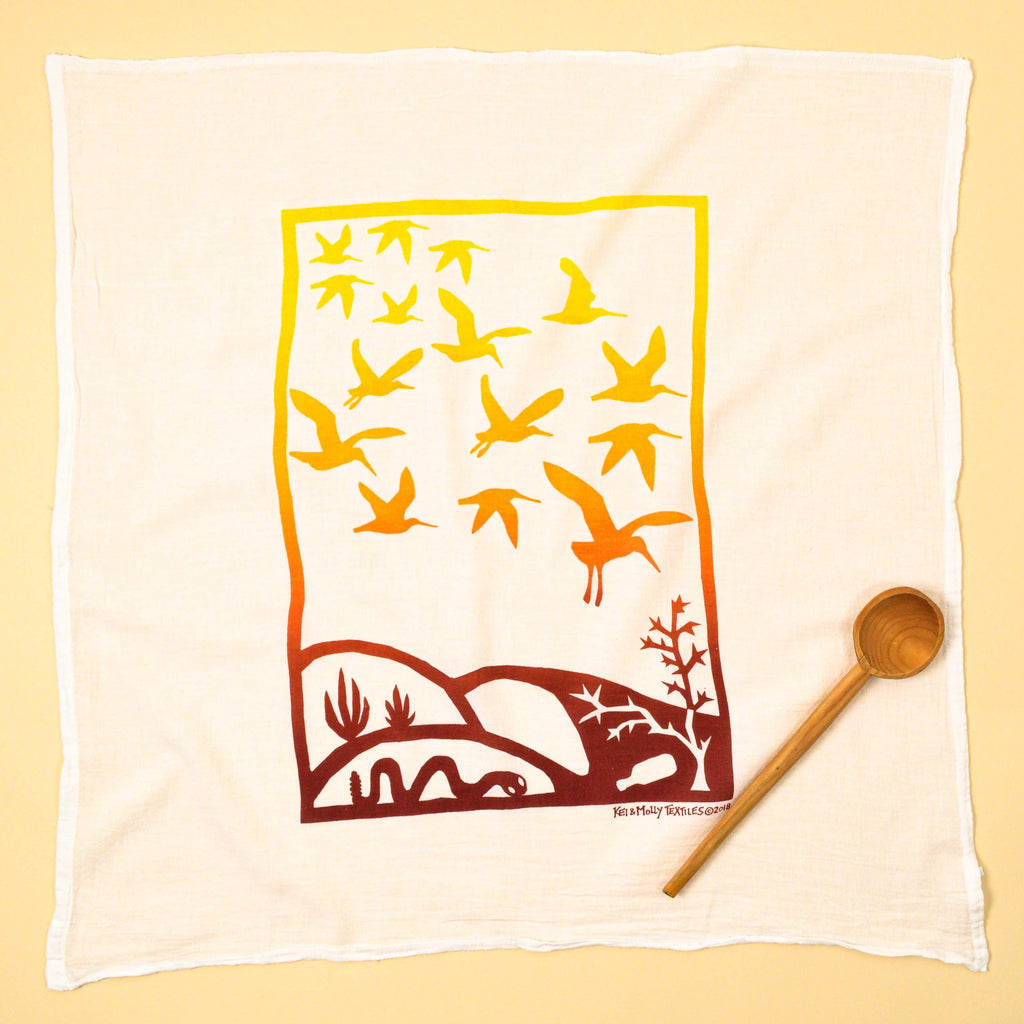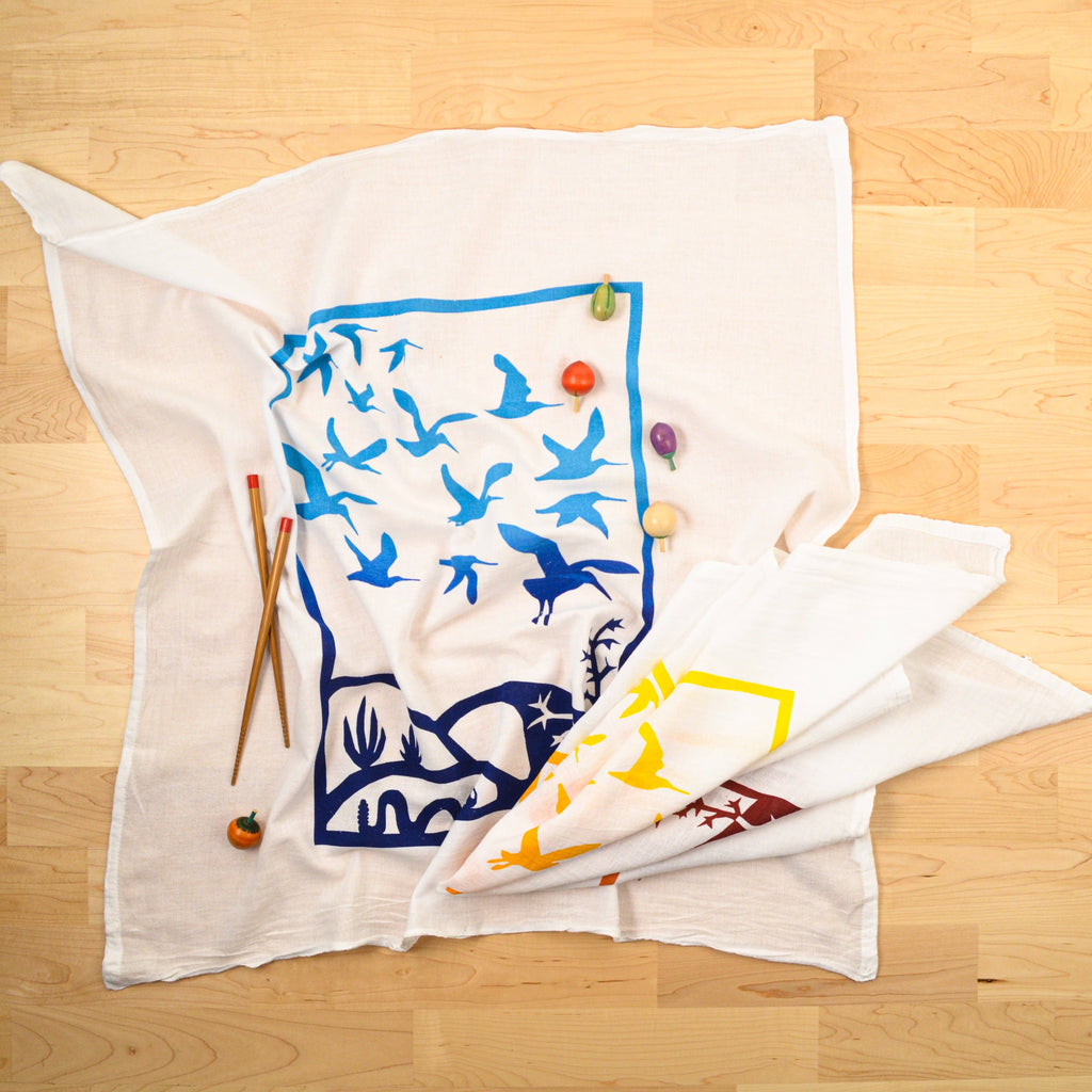 Just as we admire the flocks of birds flying south for the winter to escape the cold, so do we respect the humans who uproot themselves from their homeland in search of a better life. These 100% cotton Flour Sack Dish Towels are hand-printed in Albuquerque using water-based, eco-friendly inks. They are highly absorbent, lightweight, and won’t leave lint on your glassware. Our customers swear by them! They’ll make a colorful addition to any home. Specs: Minimum Quantity: 4 Towel Size: Approximately 29”x29” Printed Image Size: 14”x19” 100% Cotton / Imported from Pakistan Hand-printed in Albuquerque, NM, USA using water-based, eco-friendly inks Care: Machine wash cold to keep colors bright. Use non-chlorine bleach for stains. Tumble or line dry. Iron from backside if desired. Custom colors are available off of our swatch card (minimum quantity 24). Please contact us if you are interested.