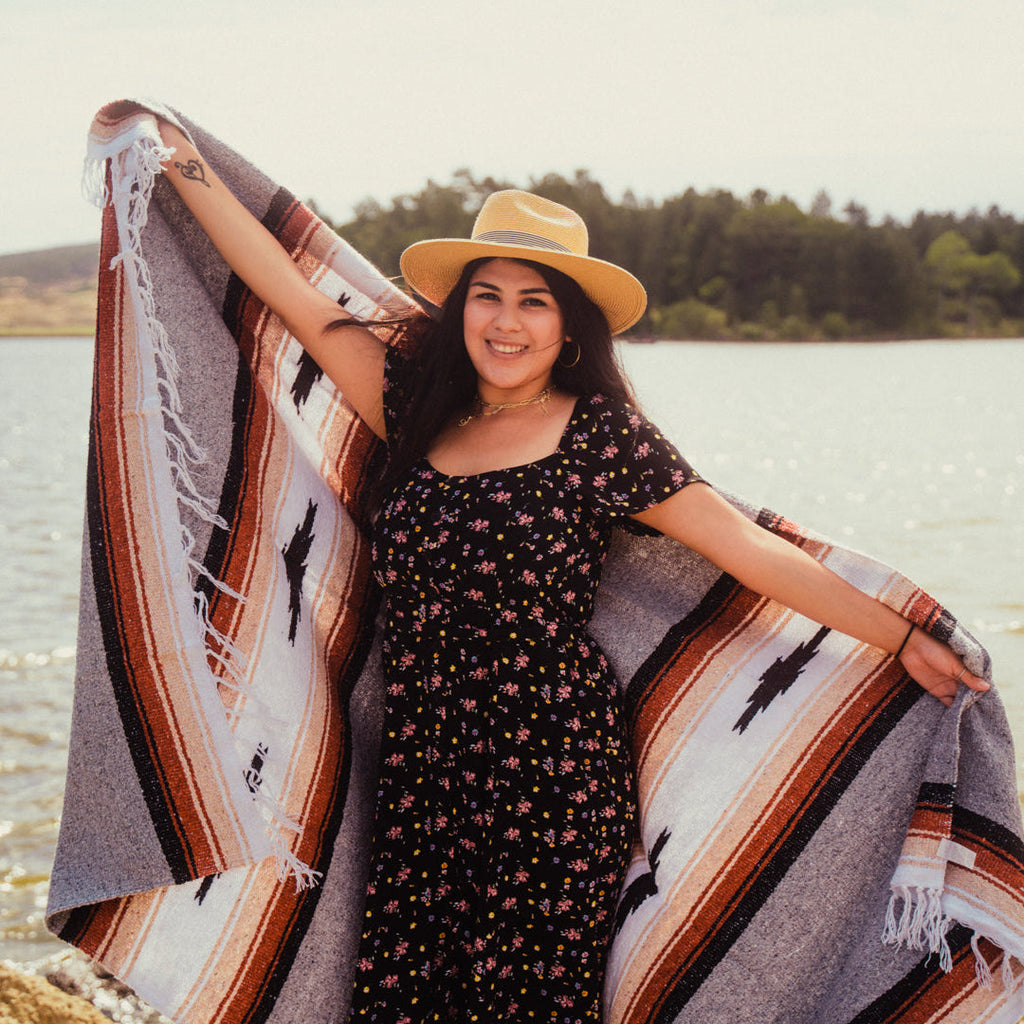Baja Mexican Diamond Yoga Blanket in our custom designed heather grey, with natural khaki, orange and black stripes. This batch made extra thick, perfect for cuddling on the coach, using for meditation/yoga or picnicking in the yard.