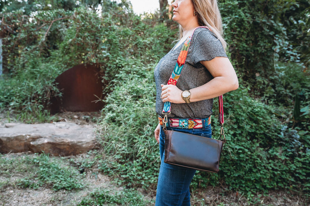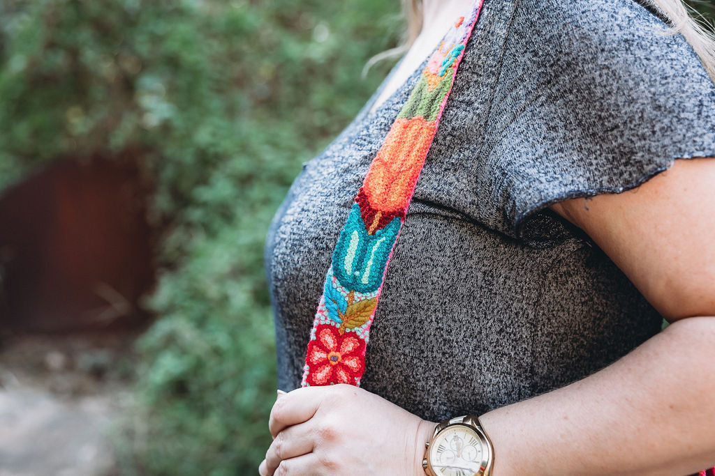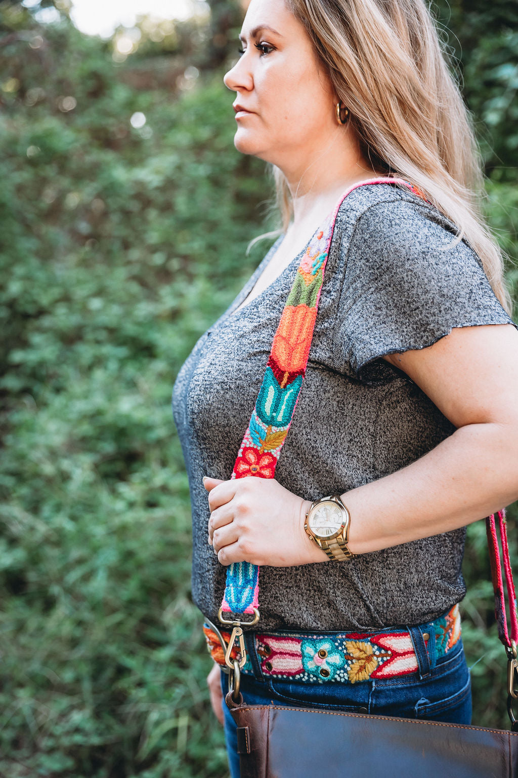Hot Pink fabric with bright multicolor floral hand embroidery. Adjustable strap. Pairs perfectly with the Dena or Anna purse. Hand embroidered by Fair Trade artisans in the Andes mountains in Peru.