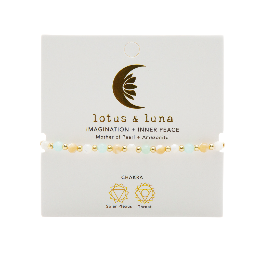 Born from the fluid power of the ocean, Mother of Pearl stimulates imagination and intuition, providing protection from negativity and allowing creativity to flow freely. Amazonite soothes the spirit and calms the soul, bringing an overall sense of inner peace to mind and body.