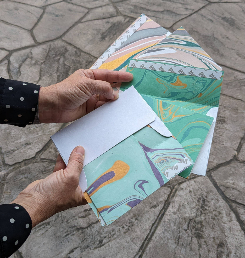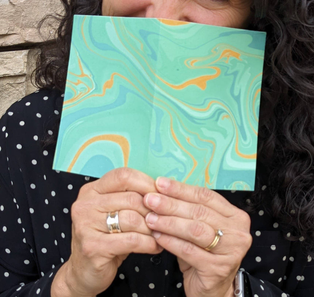 This individually packaged greeting card has been marbled by hand in in swirling shades of green and gold. It includes an envelope that features the same pattern on the inside for a surprise pop of color.
