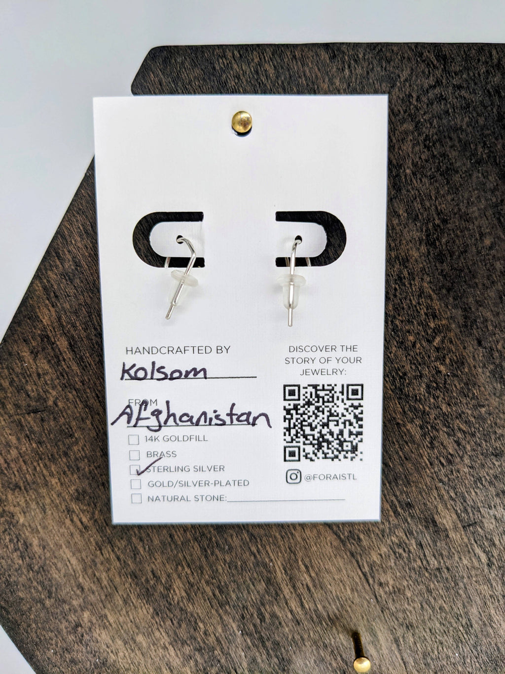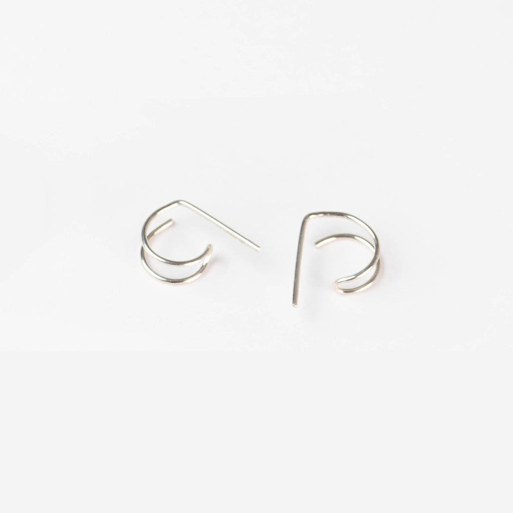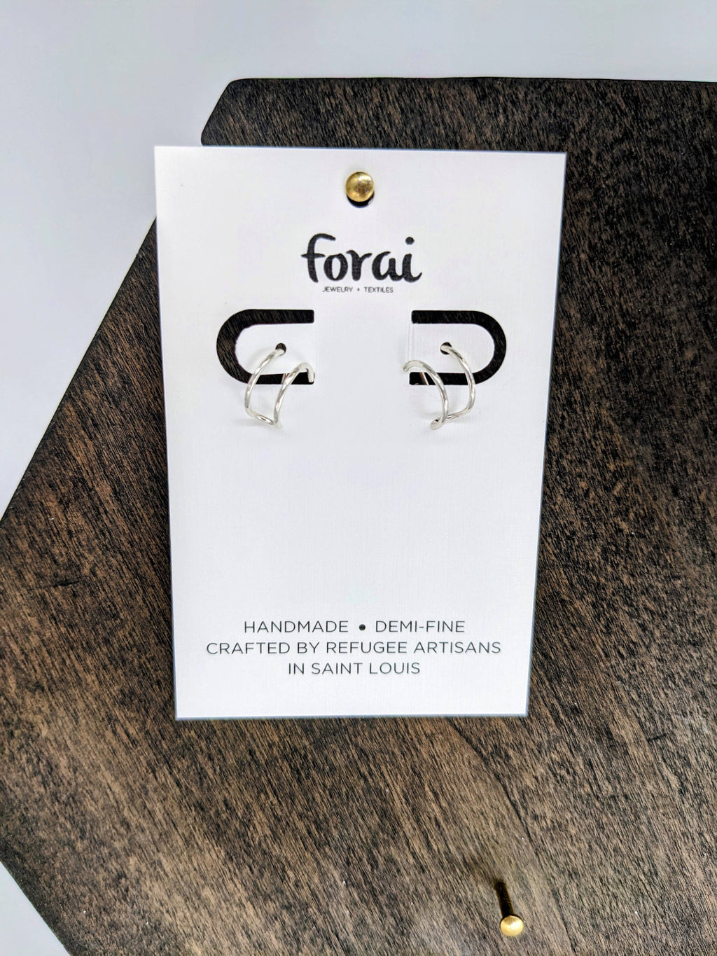 These dainty, sterling silver huggie earrings with hand-hammered detail reflect the courageous journey of hope made every Forai artisan. Gives the appearance of wearing two tiny hoops while only requiring a single piercing. Perfect for everyday wear and stacking with other earrings to create the "curated ear" look! 0.925 Sterling Silver. 3/8" by 2/16" SUSTAINABILITY AND VALUES: Women-founded and run brand. Designed by an all-female team in St. Louis, MO. 0.925 sterling silver wire sustainably-sourced in Albuquerque, NM. Hand-crafted by fairly paid, resettled refugee and immigrant women in St. Louis, MO. CARE AND QUALITY: Store with jewelry of the same tone (silver with silver, gold with gold). Gently polish with a jewelry polishing cloth as needed.