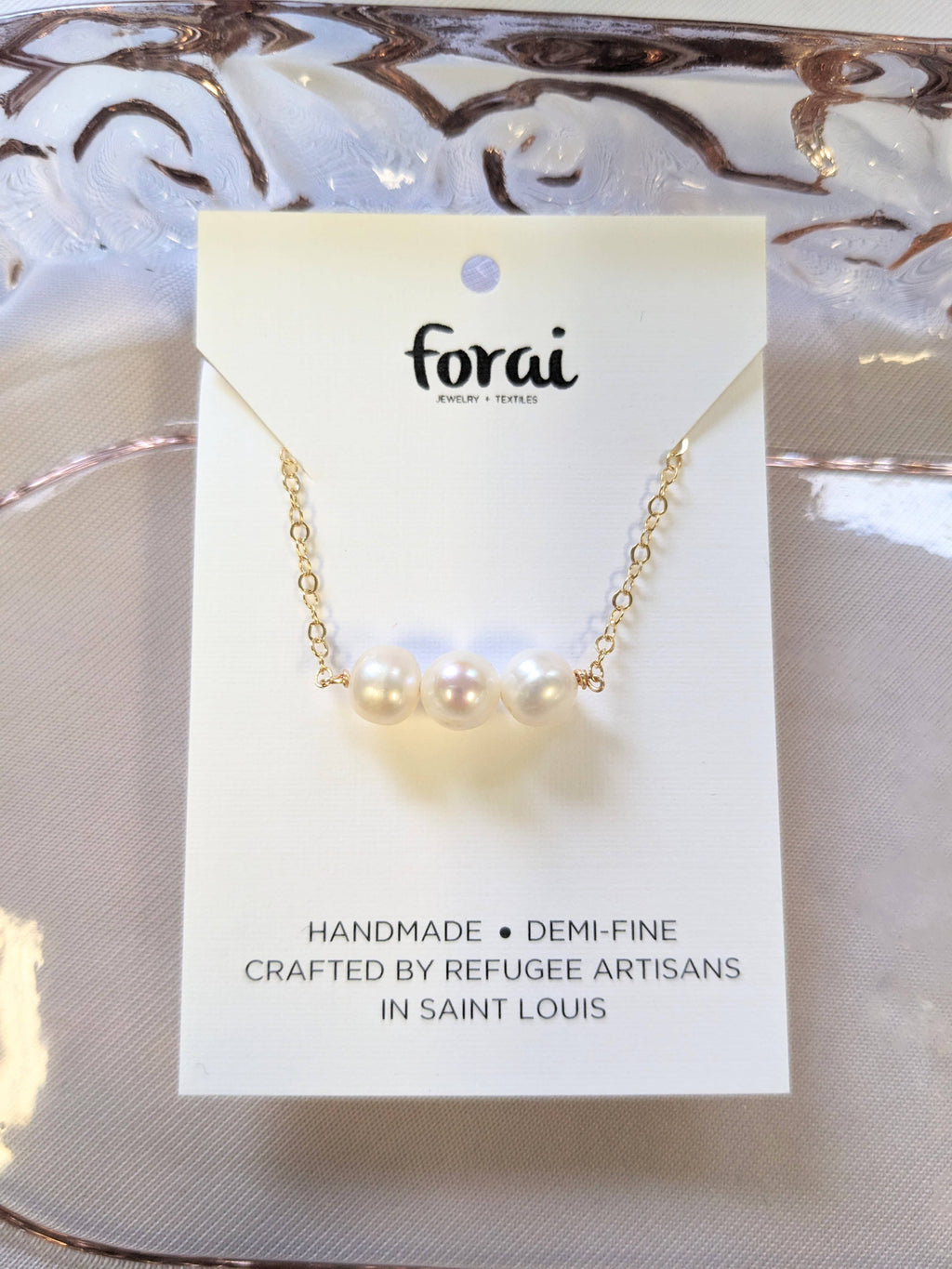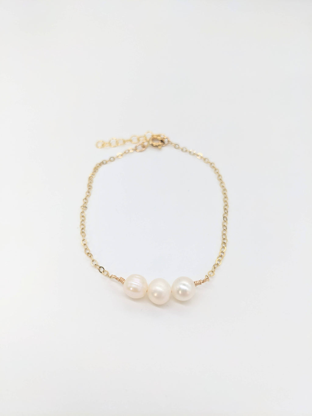 A dainty 14k gold-filled bracelet with three freshwater pearls adds a touch of elegance to any outfit. Named after one of our refugee artisans from Afghanistan. 14k gold filled chain and findings. Freshwater pearls. Length 6.25" (up to 7.25" with included extension chain). See photos for packaging details.
