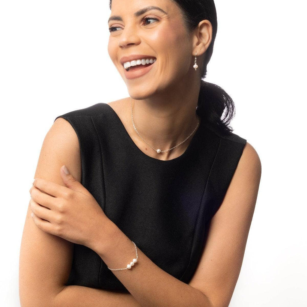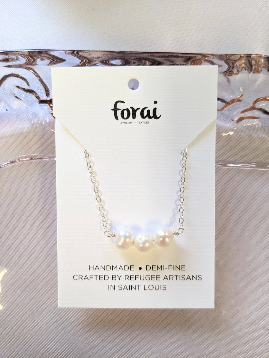 A dainty sterling silver bracelet with three freshwater pearls adds a touch of elegance to any outfit. Named after one of our refugee artisans from Afghanistan. 0.925 sterling silver chain and findings. Freshwater pearls. Length 6.25" (up to 7.25" with included extension chain).