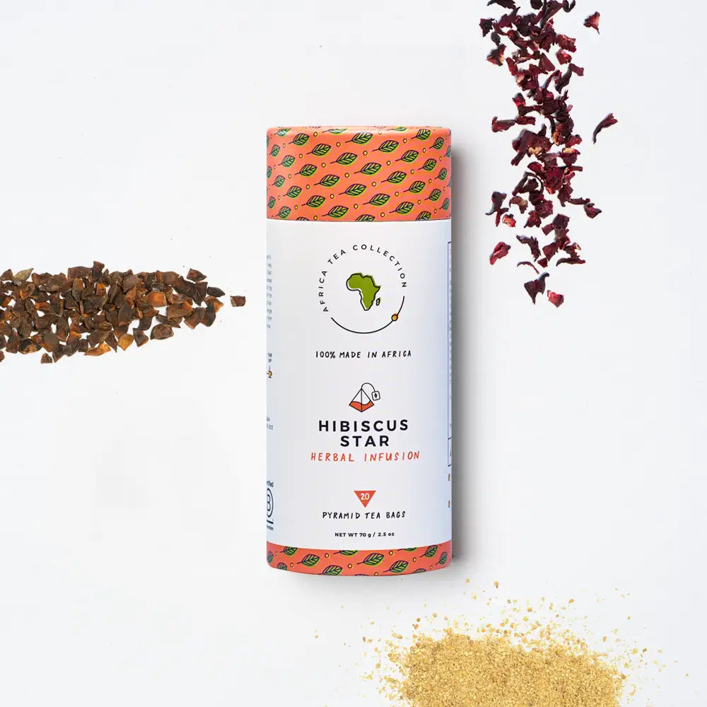 An exotic herbal blend with hibiscus, star anise, and ginger, perfect for evenings of relaxation, refreshing days, and mocktails! All teas are packed into 20 biodegradable pyramid tea bags made out of corn starch that can be composted in your local facility. All tubes are made of recyclable cardboard with an inner lining to preserve the tea and are packed by women in Tanzania. Hot Tea: Steep 1 tea bag in 2c of 194F water. Brew for 3-4 minutes. Add a dash of milk for a latte experience. Cold Tea: Steep 1 tea bag in 2c of room temp water. Brew in refrigerator for 6-8 hours and enjoy on ice.