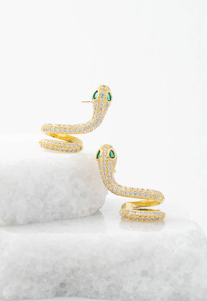 Embrace the beauty and mystery of the Little Dragon Earrings. These 18K gold-plated earrings, encrusted with sparkling zircon stones, are designed to wrap gracefully around the ear, creating a bold yet elegant statement. Inspired by the strength and beauty of the snake, the earrings feature eyes that shine with eyecatching emerald green crystals, adding a striking detail. 2025 marks the Lunar Year of the Snake, often referred to as the "Little Dragon"—a symbol of transformation, resilience, and renewal. Wear or gift these earrings as you celebrate the journey of change and the hope your purchase provides. Box size and color may vary. Materials: 18k gold plated brass and zircon earrings Hypoallergenic; lead and cadmium free with nickel content less than100ppm. Size: 1.02 inches