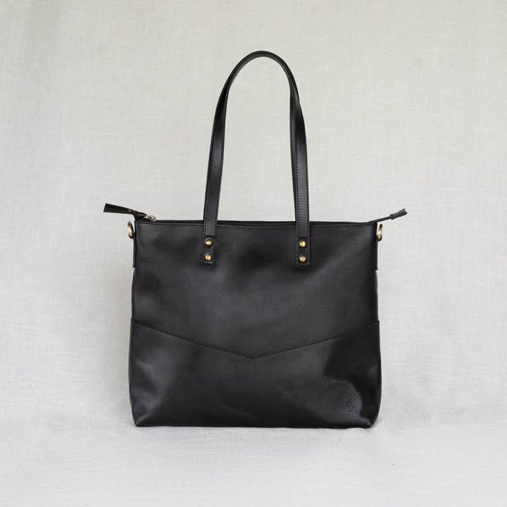 Description Need a tote that carries it all without sacrificing size? So enters our mid-sized zipper tote. Featuring a zipper closure and a crossbody strap to go hands free, you'll love the functionality of the mid-sized zipper tote! Fully-lined with an open and zipped pocket on the inside, this bag will carry all of your essentials, plus more. This full-grain leather bag is a closet staple for many women and will be a go-to for years to come. 13" wide, 12" tall, and 2" deep at bottom of bag Crossbody strap to go hands free Zipper closure at top Inside pockets Handmade by artisans in India Each piece is handcrafted with 100% full-grain, vegetable tanned leather - the highest quality leather on the market (two grades above genuine).