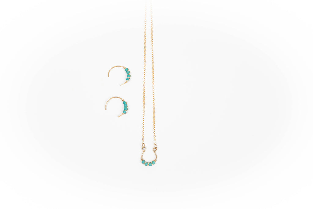Add a touch of Western charm with the Moab Western Beaded Necklace. Featuring a horseshoe design pendant, miyuki turquoise beads, and 14k gold filled chain, this handmade necklace is both stylish and unique. Plus, each purchase supports resettled refugee women. Pair with our Moab Western Beaded Hoop Earrings in 14k gold filled. SUSTAINABILITY AND VALUES: Women-founded and run brand. Designed by an all-female team in St. Louis, MO. 14k gold filled chain and findings are sustainably-sourced in Albuquerque, NM. Hand-crafted by fairly paid, resettled refugee and immigrant women in St. Louis, MO. CARE AND QUALITY: 14k gold filled chain and findings. Miyuki glass seed beads. Length 16" + 2" extension chain. Store with jewelry of the same tone (silver with silver, gold with gold). Gently polish with a jewelry polishing cloth as needed.