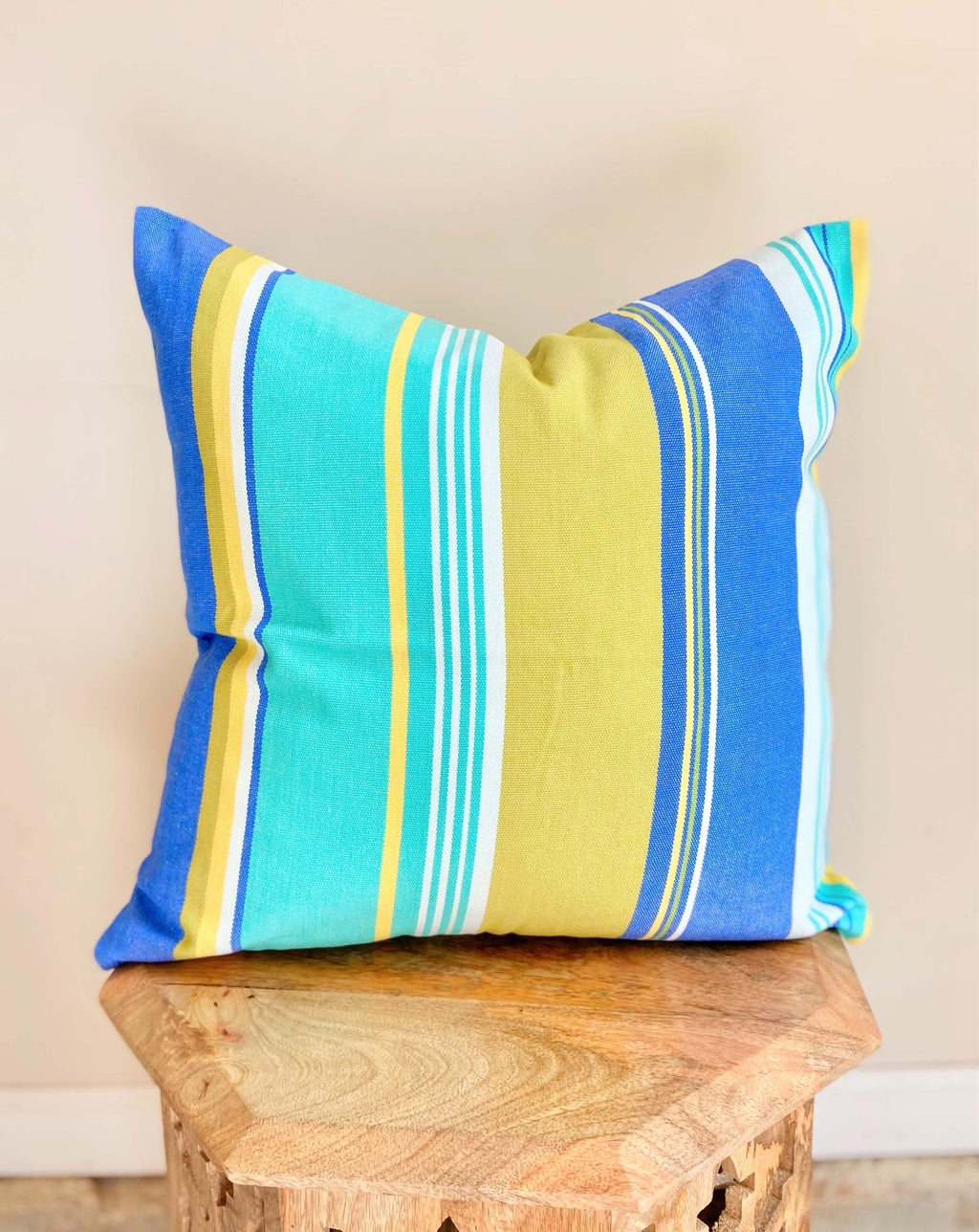 Traditional stripes meet bold colors. This pillow has beautiful blues and green stripes with relaxing hues that inspire relaxation and serenity. This is a gorgeous 100% woven cotton fabric woven in a traditional pattern. The fabric is very high-quality cotton, thick and sturdy.