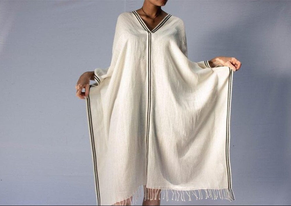 These Fair Trade, eco friendly, pure cotton Ethiopian kaftan are great for the beach, the pool, home or even a day at the market. The kaftan is stitched on the side, has black edging and fringed on the bottom. One size fits most.