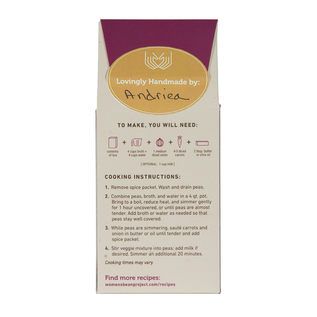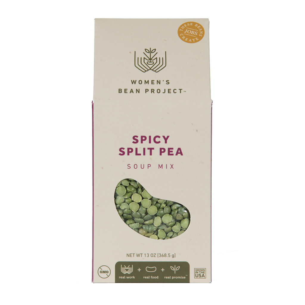 A unique blend of crushed red pepper, coriander, cinnamon, ginger spice, and curry makes Women’s Bean Project’s Spicy Split Pea Soup Mix the most unique on the market. It is quick and easy to prepare, grown in the USA and Colorado Proud. Split pea soup package includes green split peas and spice blend. Soup and chili mixes Each box makes 7-8 servings Box comes sealed with a Lovingly Handmade Sticker Includes premium seasonings Prepare on the stove or in the slow cooker Non-GMO and Made in the USA.
