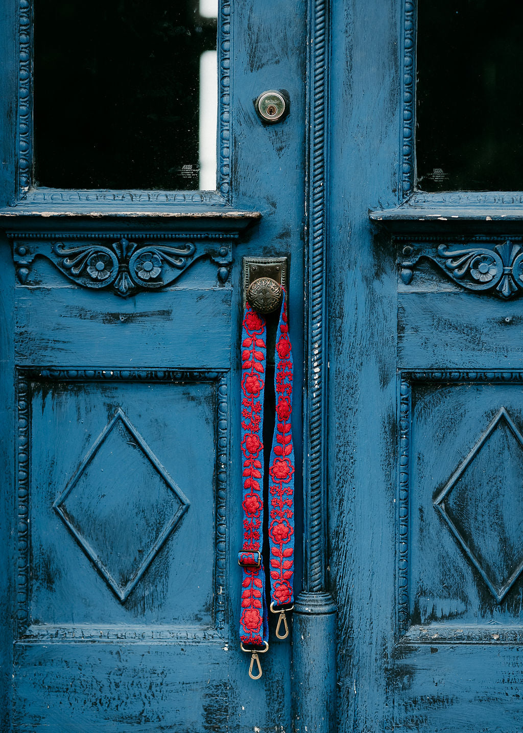 Taylor is the perfect strap to show your school pride! Blue fabric with red floral and leaves design. Hand embroidered in the Andes mountains of Peru by Fair Trade artisans. Looks great under Friday night lights or at the tailgate on Saturday.